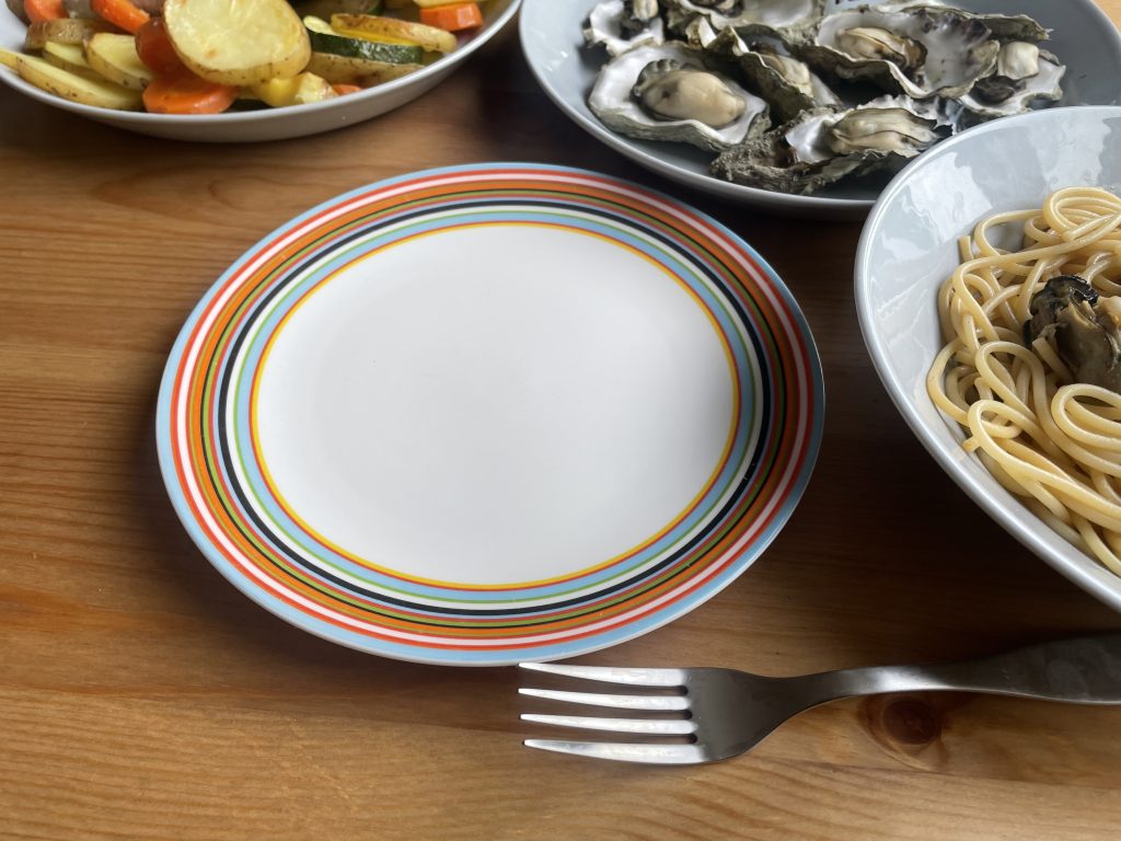 イッタラ(iitala)オリゴ20cmプレートのオレンジ。一見派手な見た目と色合いのお皿で、暗い気持ちの時でも食卓を明るくし、元気づけてくれる。オリゴは使いにくい?盛り付けるとどんな雰囲気?実際の盛り付け例、使い方ブログ。