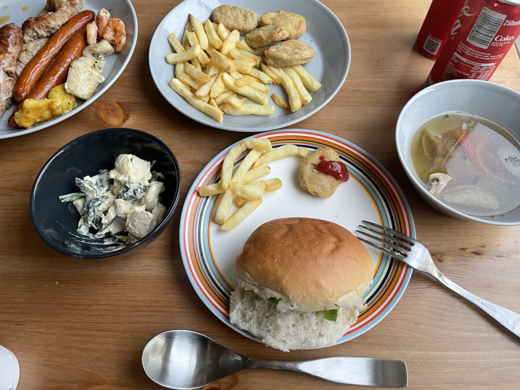 ハンバーガーパーティーの取り皿に使用。オリゴのオレンジは華やかな色合いなので、パーティーやおもてなしのテーブルコーディネートにも良く合う。派手な色味が、どんな料理も鮮やかにしてくれる元気をくれるお皿