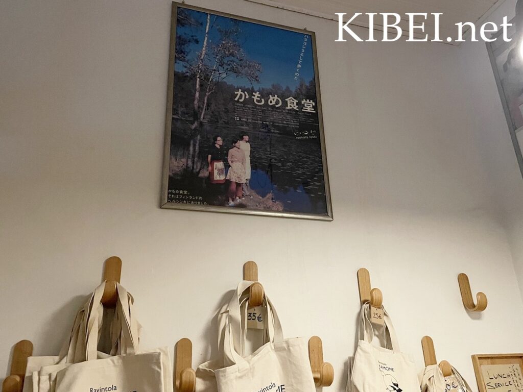 映画のポスターとかもめ食堂のグッズ。グッズはトートバッグの他にもボトルとか反射板とかナプキンとか色々販売されていました。
