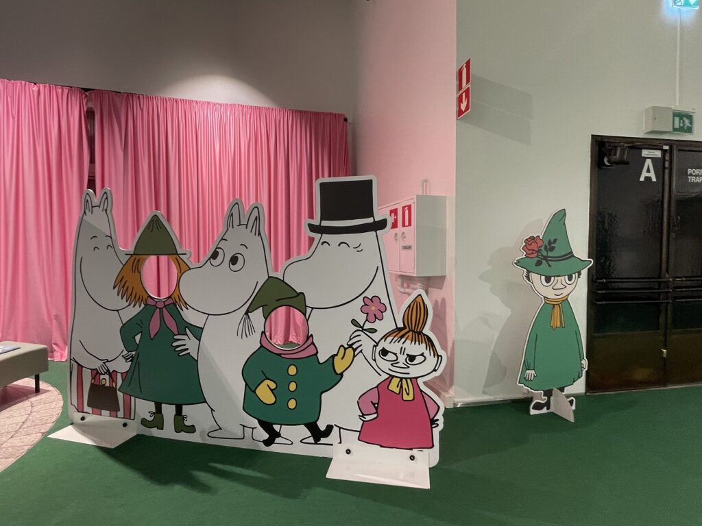 パネルの他、ムーミンの本があったり子供も楽しめそうな空間です。グリーンとピンクを中心に統一され、80年の歴史が分かるようになっており博物館のようで、ムーミンファン必見の展示になっていました。